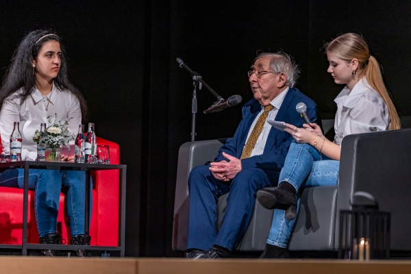 Itzehoe, 27.1.2026: Gedenkfeier für die Opfer des Nationalsozialismus, Schülerinnen sprechen mit dem Holocaust-Überlebenden Nicolaus BlättermannFoto: Landtag, Sönke EhlersGröße: 3 MB -