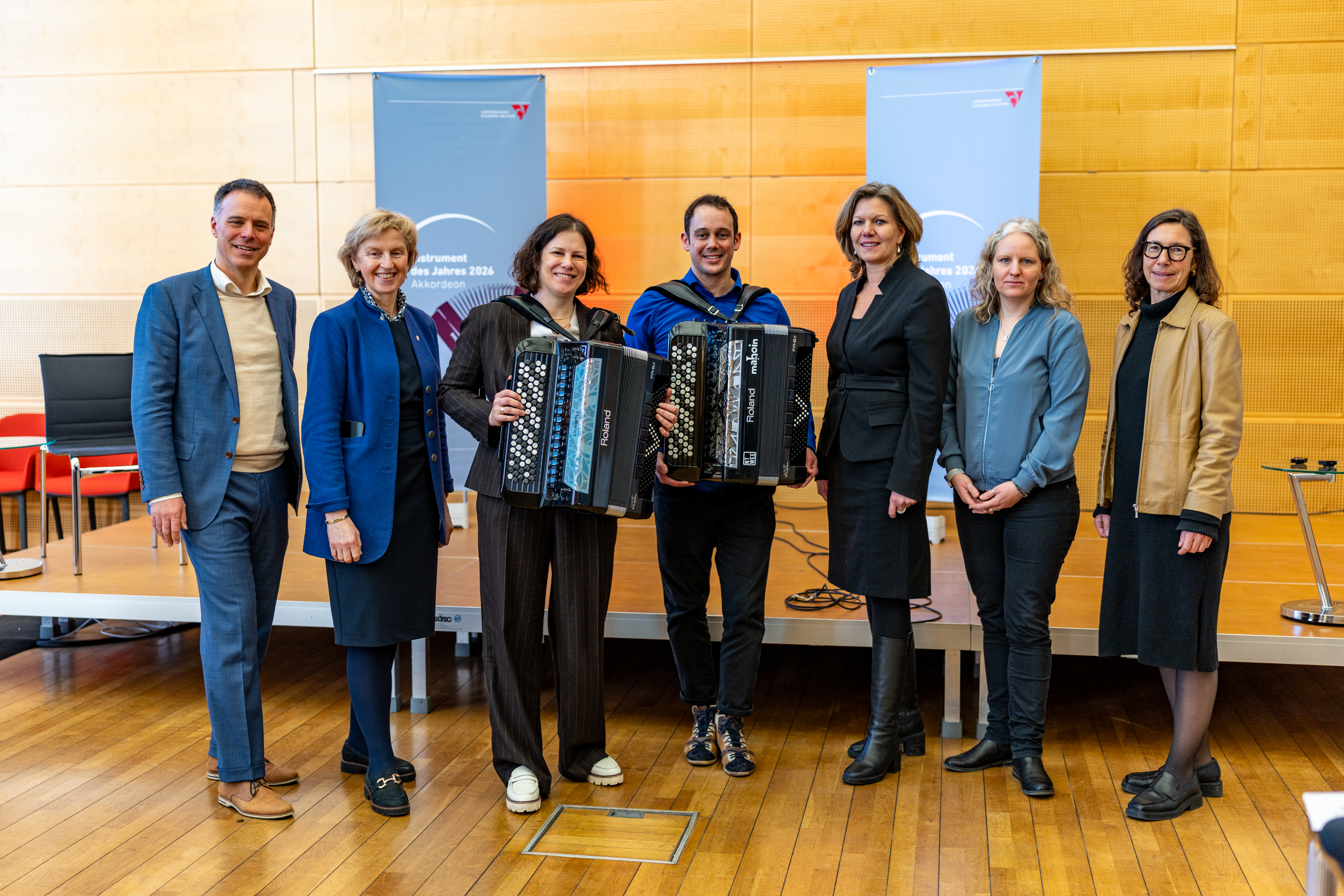 Kiel, 14.01.2026: Vorstellung "Instrument des Jahres 2026". v. l. n. r.: Hartmut Schröder (Landesmusikrat), Anette Röttger (CDU), Landtagspräsidentin Kristina Herbst, Nenad Nikolic (Botschafter Akkordeon), Gyde Opitz (Sparkassen- und Giroverband), Alexandra Ehlers (Landesmusikrat), Uta Röpcke (Grüne)Foto: Landtag, Sönke EhlersGröße: 9 MB -