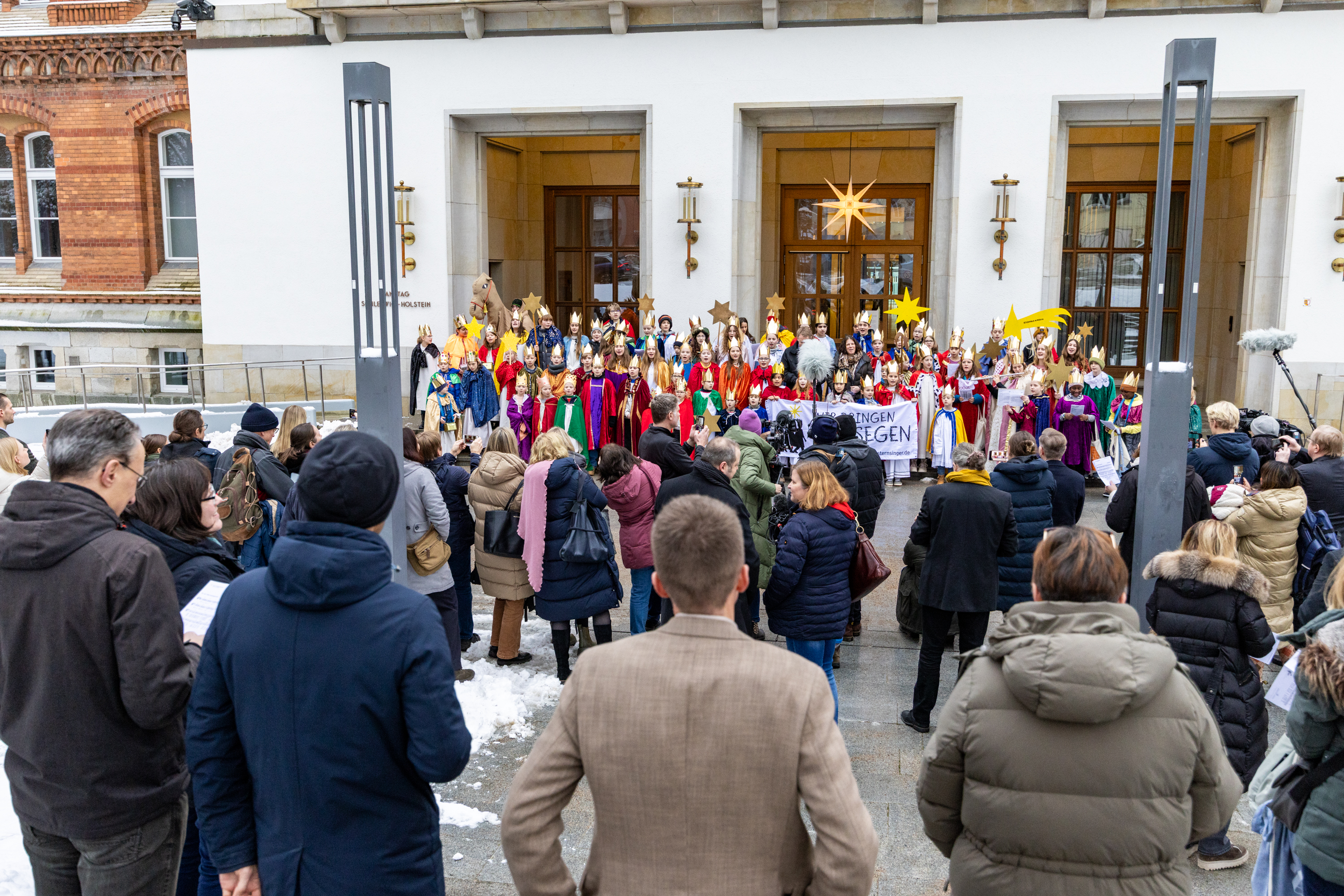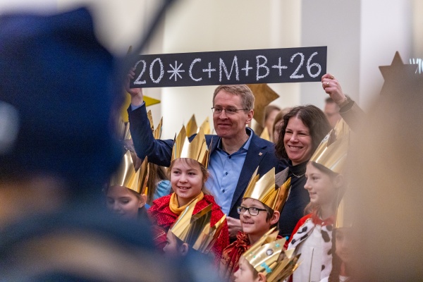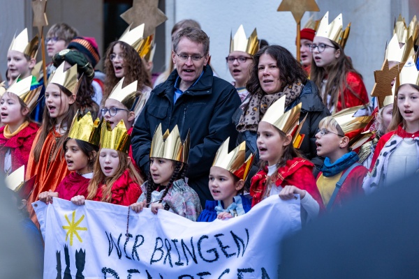 Kiel, 6. Januar 2025: Sternsinger besuchen am Tag der Heiligen Drei Könige den Landtag. Mit Parlamentspräsidentin Kristina Herbst und Ministerpräsident Daniel Günther singen sie vor dem Landeshaus ein erstes Lied.Foto: Landtag, Sönke EhlersGröße: 4 MB -