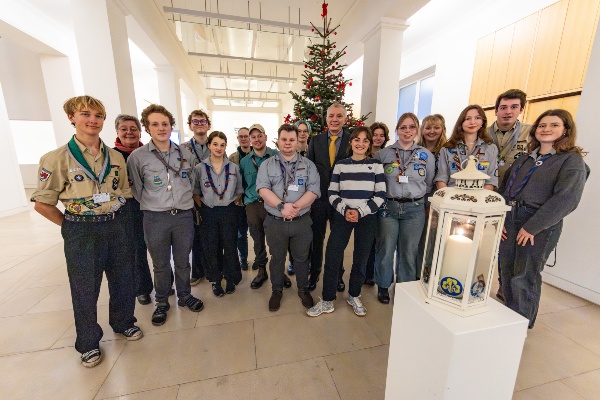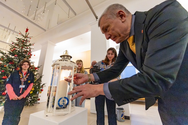 Kiel, 8. Dezember 2025: Das Friedenslicht aus Bethlehem ist im Schleswig-Holsteinischen Landtag angekommen. Pfadfinderinnen und Pfadfinder haben es im Landeshaus gemeinsam mit Landtagsvizepräsident Peter Lehnert entzündet.Foto: Landtag, Sönke EhlersGröße: 4 MB -