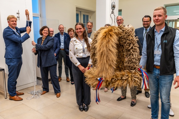 Heiner Rickers, Vorsitzender Agrar- und Umweltausschuss und Landtagspräsidentin Kristina Herbst ziehen die Erntekrone der Landjugend Rendsburg-Eckernförde an die Decke der Eingangshalle im Landtag. Jula Butenschön und Hauke Junghohann befestigten sie am HakenFoto: Landtag, Sönke EhlersGröße: 4 MB