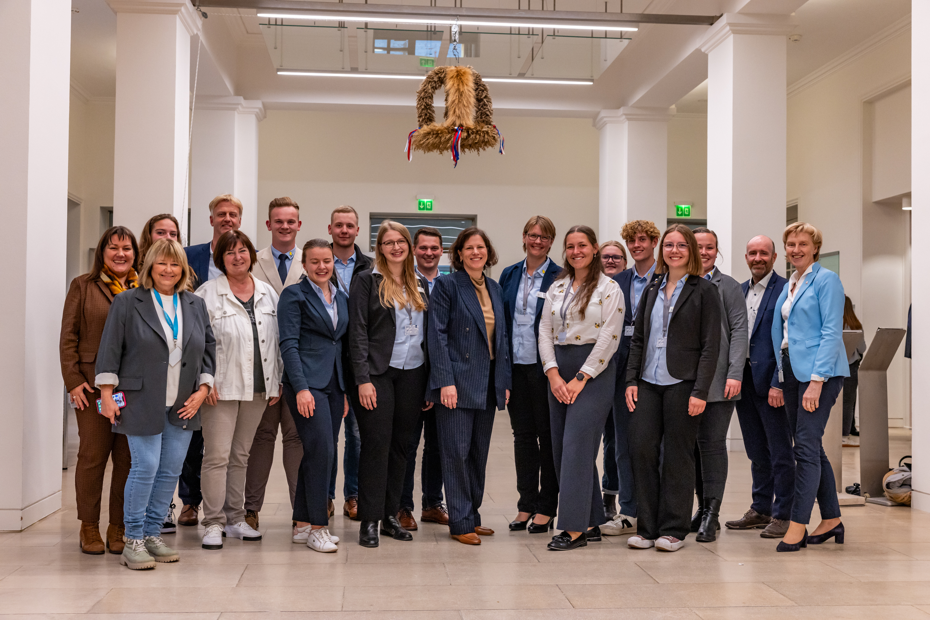 ÜbLandtagspräsidentin Kristina Herbst (links) begrüßt Tessa Nafziger, 1. Vorsitzende der Landjugend im Kreis Rendsburg-Eckernfördeergabe der ErntekroneFoto: Landtag, Sönke EhlersGröße: 3 MB
