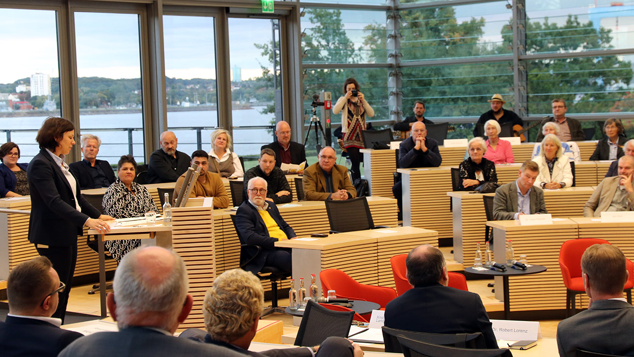 „Ich freue mich, dass mit der Ausstellung die scheinbar einfache Frage ‚Was heißt hier Minderheit?‘ beantwortet wird“, sagte Landtagspräsidentin Kristina Herbst zur Eröffnung der Ausstellung am 21. September vor rund 100 Gästen im Plenarsaal. „Ihr Kernanliegen ist, gegenseitiges Verständnis zwischen Minderheiten und Mehrheitsgesellschaft zu schaffen, die Perspektive zu ändern und den Blickwinkel des jeweils anderen einzunehmen.“ Das eigentlich abstrakte Thema werde in der Ausstellung anschaulich, modern, interaktiv und mit Witz und Spaß umgesetzt, warb die Landtagspräsidentin für den Besuch der Schau. „Die Ausstellung macht Lust auf Begegnung miteinander“, hob Herbst hervor. „Und sie zeigt sowohl, was jede einzelne Minderheit auszeichnet, als auch das Verbindende zwischen ihnen. Die Gesamtschau ergibt ein ebenso stimmiges wie spannendes Gesamtbild – eine perfekte Metapher für unsere Minderheiten und unsere Gesellschaft insgesamt.“
