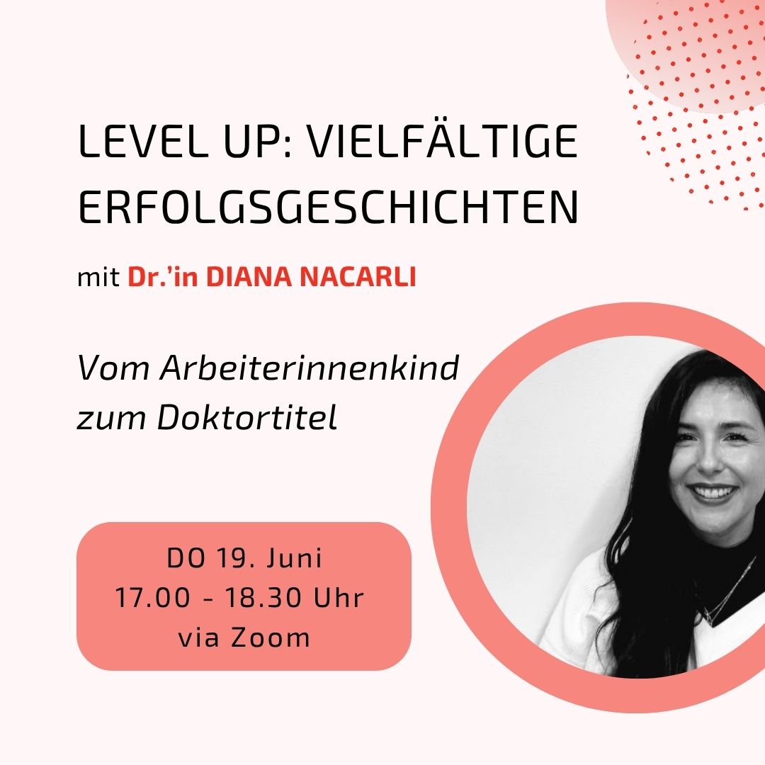 Am 19. Juni sprechen wir mit Dr.‘in Diana Nacarli. Sie berichtet davon, wie es ihr gelang, trotz Startschwierigkeiten und mehrfachen Abbrüchen auf dem Bildungsweg am Ende einen hohen akademischen Grad zu erlangen. Sie wird dabei auch von dem Weg in die Promotion sowie (unvorhergesehenen) Hindernissen sprechen und erzählen, wie sie diese gemeistert hat. Wir freuen uns auf euch, eure Fragen und eure Kommentare!