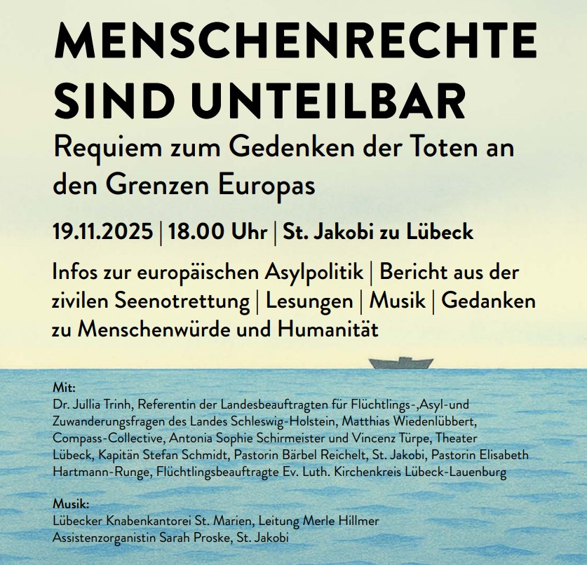 Unter dem Motto „Menschenrechte sind unteilbar“ laden die Lübecker Jakobi-Kirchengemeinde, die Flüchtlingsbeauftragte des Kirchenkreises Lübeck-Lauenburg, das Theater Lübeck und die Landesbeauftragte für Flüchtlings-, Asyl- und Zuwanderungsfragen in diesem Jahr erneut zu einem Requiem zum Gedenken der Toten an den Grenzen Europas ein.
