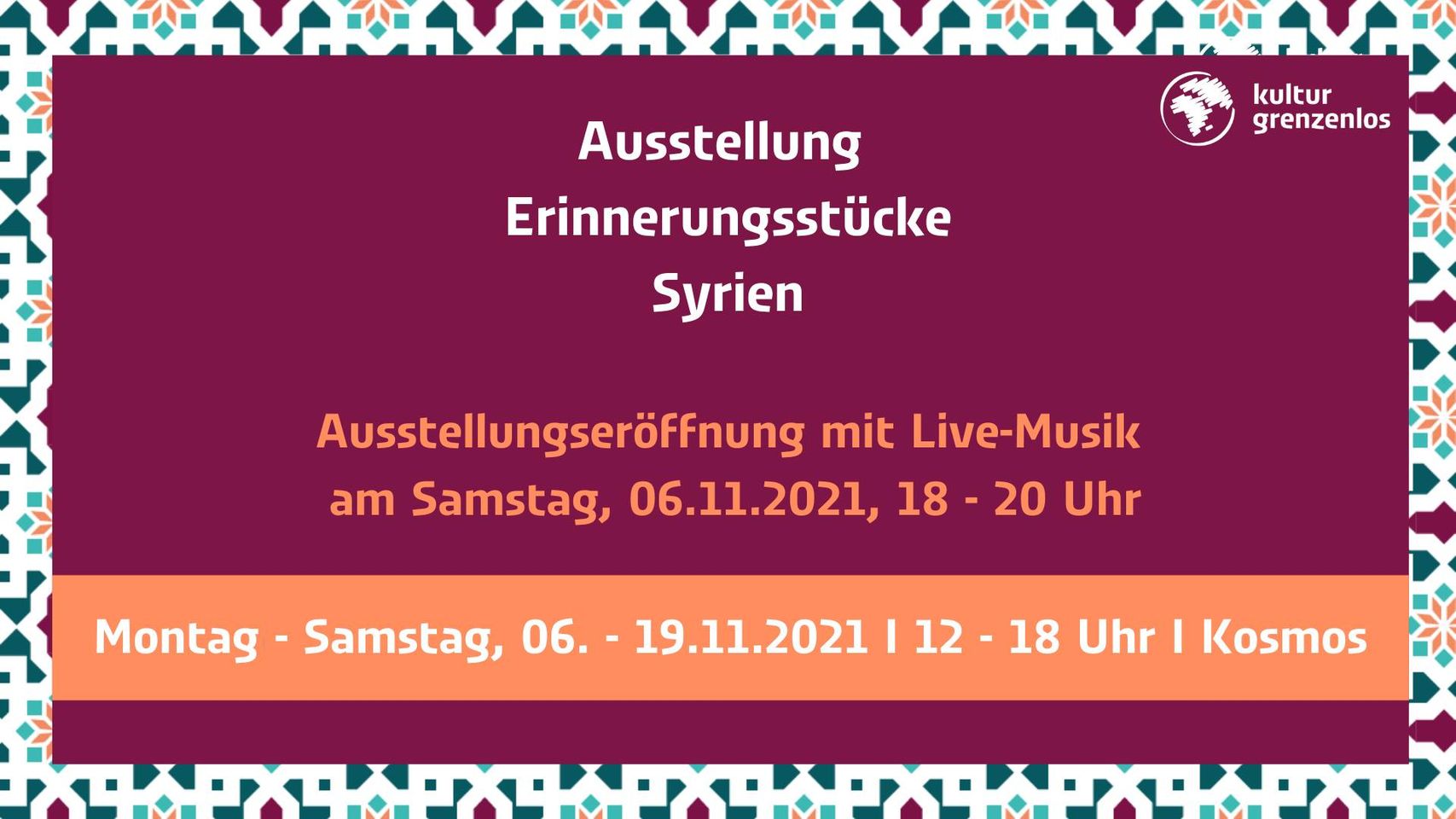 Das Projekt Kulturgrenzenlos und der Beauftragte für Flüchtlings-, Asyl- und Zuwanderungsfragen. Die Ausstellung ist ein Teil der Kulturwochen Syrien "Der andere Blick".