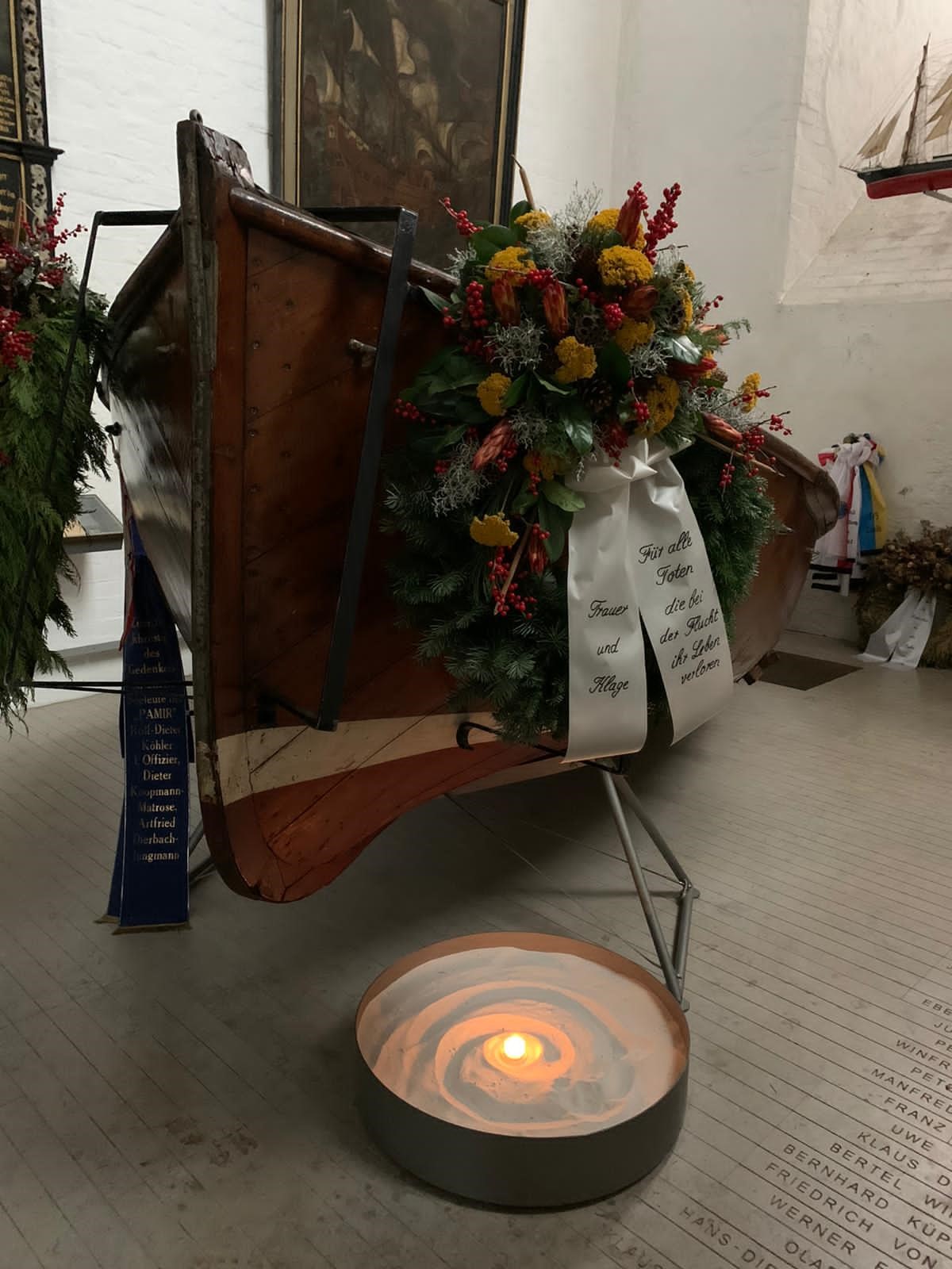 Kranz am Rettungsboot der Pamir in der Jakobikirche zu Lübeck