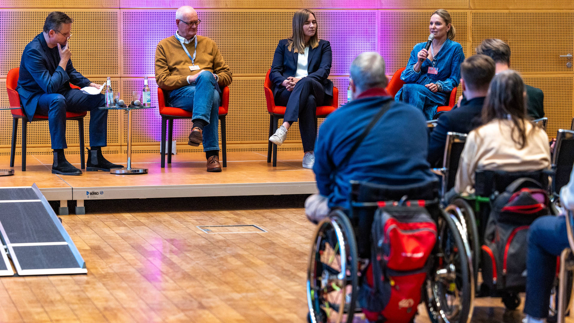 Im Anschluss an die Grußworte folgten zwei Gesprächsrunden, in denen Vertreterinnen und Vertreter aus Verwaltung, Verbänden und aktivem Sport unterschiedliche Facetten von Inklusion und Teilhabe beleuchteten. In der ersten Runde diskutierten die Landesbeauftragte für Menschen mit Behinderungen, Michaela Pries, der Präsident des Rehabilitations- und Behinderten-Sportverbandes Schleswig-Holstein, PD Dr. Thorsten Schmidt, der stellvertretende Athletensprecher Special-Olympics Christian Heesch sowie die Landestrainerin Para-Taekwondo Martina Lüdders unter der Moderation des Journalisten Andreas Käckell. Im Mittelpunkt standen grundlegende Fragen: Wie gut funktionieren Inklusion und Teilhabe in unserem Land und wie gut im Sport? Wie sehen Alltag und Sport mit einer Behinderung aus? Welche Hilfestellungen gibt es durch Verbände, Politik, Interessenvertretungen?