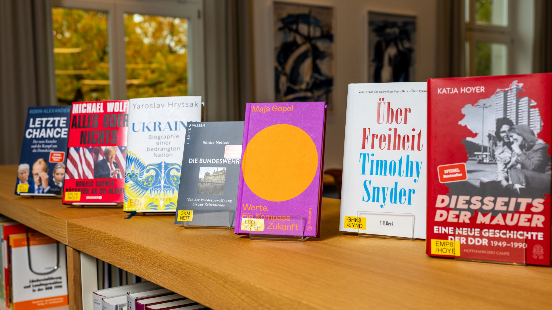 Die Schwerpunkte der Landtagsbibliothek im 2. Stockwerk des Landeshauses liegen unter anderem im Recht, in der Politik sowie in Geschichte und Landeskunde. Nach einem Umbau ist sie im April 2023 in einem moderneren, helleren und freundlicheren Gewand neu eröffnet worden. „Wir suchen danach aus, was an aktuell wichtigen Themen stattfindet“, sagt Bibliotheksmitarbeiterin Pamela Kahl. Bei der Suche nach neuer Literatur lasse sie sich vom an sie herangetragenen Bedarf, aber auch von anderen Bibliotheken, einschlägigen Fernsehsendungen und Bestsellerlisten inspirieren. „Die Bücher kommen mir überall entgegen.“ Derzeit wichtige Themen seien etwa die Bundeswehr und Verteidigung, künstliche Intelligenz, Klima, Demokratie und Freiheit.